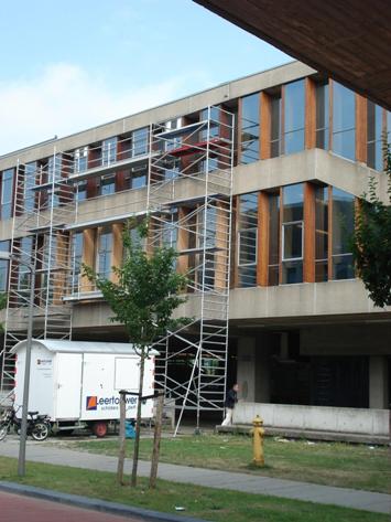 Het Delftse bedrijf zorgt ervoor dat het houtwerk en de betimmering aan de buitenkant van de Aula straks vele tinten lichter is dan nu. “We gaan terug naar de originele kleur”, aldus Lassche. Daarmee wordt een situatie hersteld die de afgelopen twintig jaar geleidelijk is ontstaan.