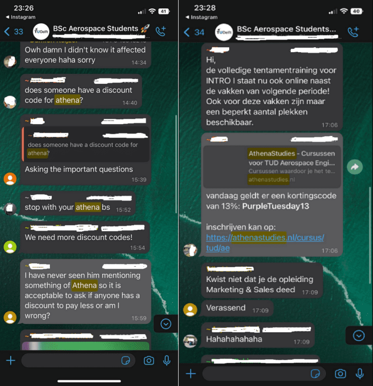 One student at the Faculty of Aerospace Engineering (AE), who did not want to be named (his name is known to Delta.), responded. This student is in the third year and forwarded screenshots from a while ago. “We had a lot of spam about a year ago. There were constant messages about AthenaStudies in the app group of my year. People were removed a few times for blatantly advertising. Other students were really agitated.”