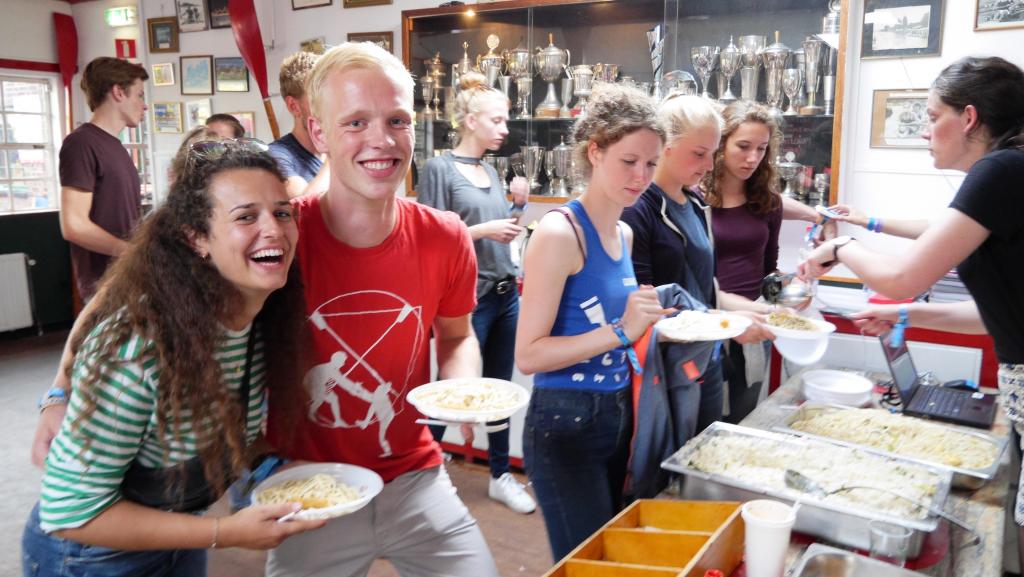 On the opposite side of the canal, the Delftsche Zwervers are enjoying their Indonesian buffet. On the menu is Rendang (Indonesian stew), Sambal Telor (eggs with sambal) and a lot of different vegetables. “It was an enormous amount of work: we started on Monday at 12:00 with the groceries for Tuesday’s meal,” says Rosanne, who made the complete buffet with two other members. “The pan of beef stew was on the stove until 02:30, and this morning we lit it again at 09:30. The last hour was stressful, but because we started in time, we managed to get it all done.” The rest of the year the Delftsche Zwervers cook on Tuesday and Thursday for EUR 3.50. If you want to join, send an email to lekkereten@delftschezwervers.nl.