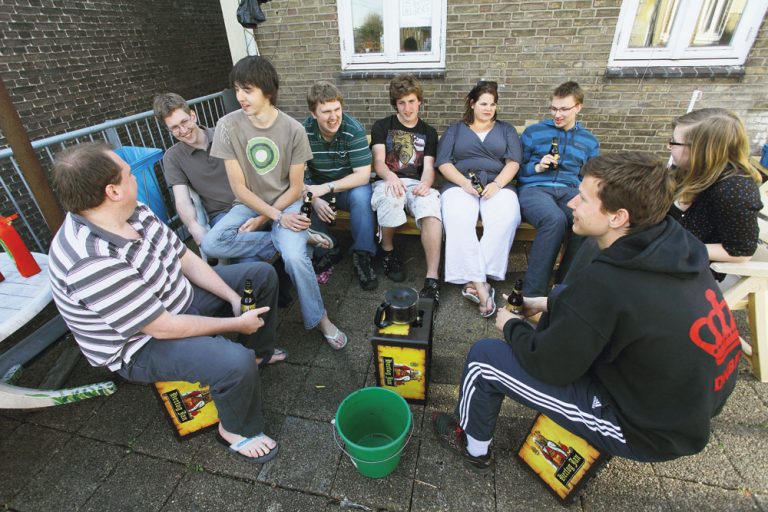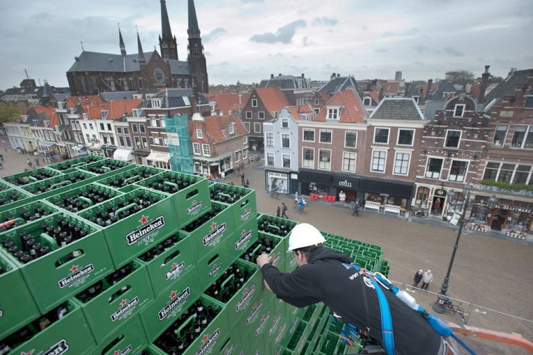 Eén kratje zit niet helemaal goed. Vanuit een hoogwerker duwt een student hem weer recht. Met hun veertien meter hoge brug van veertienduizend kratten die studenten van gezelschap Practische Studie (de studievereniging van Civiele Techniek) begin oktober op de Markt in Delft bouwen zijn ze officieel recordhouders bierkrattenbrugbouwen.