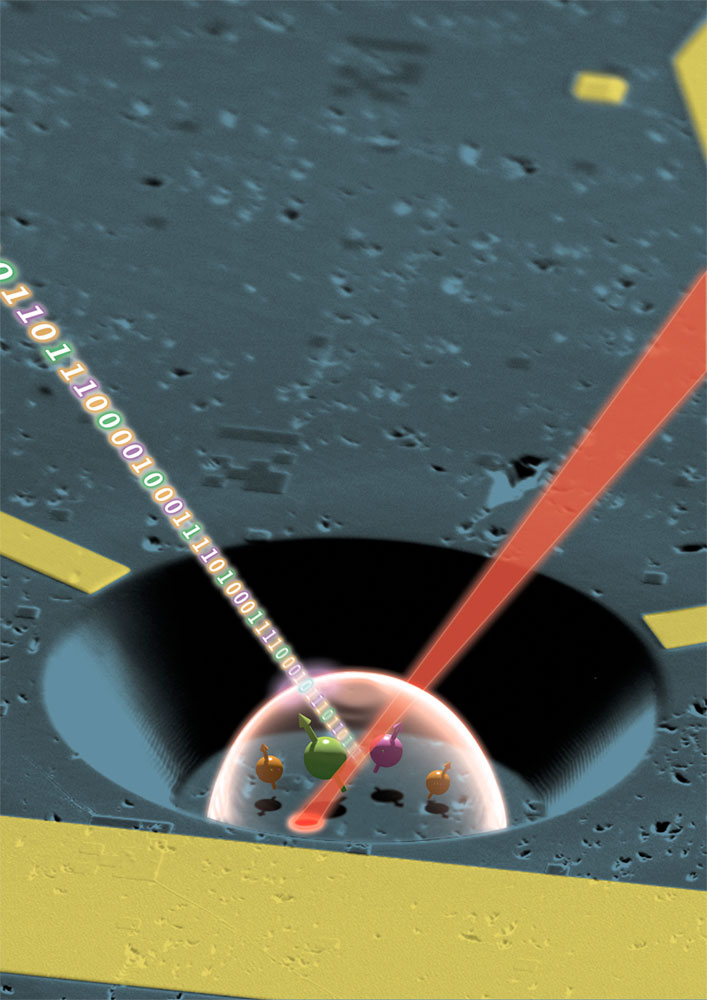 Wetenschappers van het Kavli Instituut voor Nanowetenschappen zijn erin geslaagd om een mini-quantumcomputer bestaande uit vier quantumbits op een chip van diamant zeer nauwkeurig uit te lezen. Ze publiceren hun bevindingen afgelopen najaar in Nature. De onderzoekers slaagden erin de spinrichting van het elektron uit te lezen door laserpulsen van een nauwkeurig ingestelde golflengte op het elektron af te schieten.
