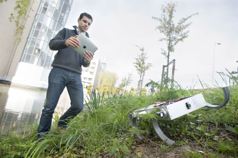 Hij rent, tuimelt en komt weer in evenwicht. Zand, gras of stenen, de robot van dr. Gabriel Lopes loopt gewoon door. Circa tien jaar geleden begon Lopes aan de universiteit van Michigan met de ontwikkeling van een zespotige robot geïnspireerd op een kakkerlak. Aan het Delft Center for Systems and Control wil de onderzoeker nog een stapje verder gaan. “We hebben aan de onderliggende wiskunde gewerkt om de synchronisatie van de poten te beheersen. Nu we de wiskunde begrijpen, kunnen we bepalen hoe de robot zijn ledematen beweegt”, zegt hij. Uiteindelijk moet de robot van Lopes in staat zijn zelfstandig om te schakelen naar een andere manier van voortbewegen. Youtube.com (zoekterm: Rhex robot en Edubot)