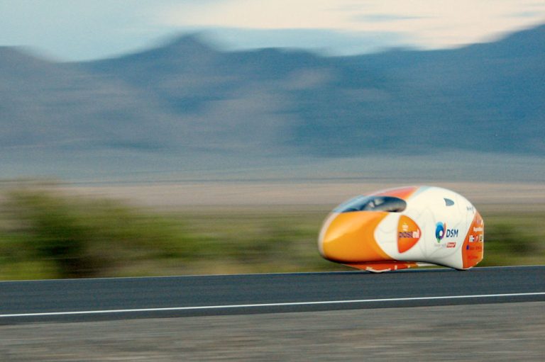 Sprinter Sebastiaan Bowier haalt in september in de woestijn van Nevada (VS) op de Velox ligfiets van het Human Power Team de ongelofelijke snelheid van 129,61 km/u. Helaas ligt het wereldrecord net iets hoger (133,27 km/u). Verreweg de belangrijkste succesfactor is de aerodynamica van Velox. De Delftse studenten ontwikkelden de fiets volledig zelf, met behulp van windtunnels, computersimulaties en testopstellingen. De selectie van de beste fietser en de optimale racevoorbereiding en –strategie was in handen van studenten Bewegingswetenschappen van de Vrije Universiteit in Amsterdam. Het Delftse team koos voor een liggende houding en een kap die extreem weinig luchtweerstand heeft. “Vergeleken met een normale fietser, heeft ons ontwerp maar één tiende van de weerstand. Daarnaast weegt het geheel slechts 20 kilo, vergelijkbaar met een stadsfiets.”