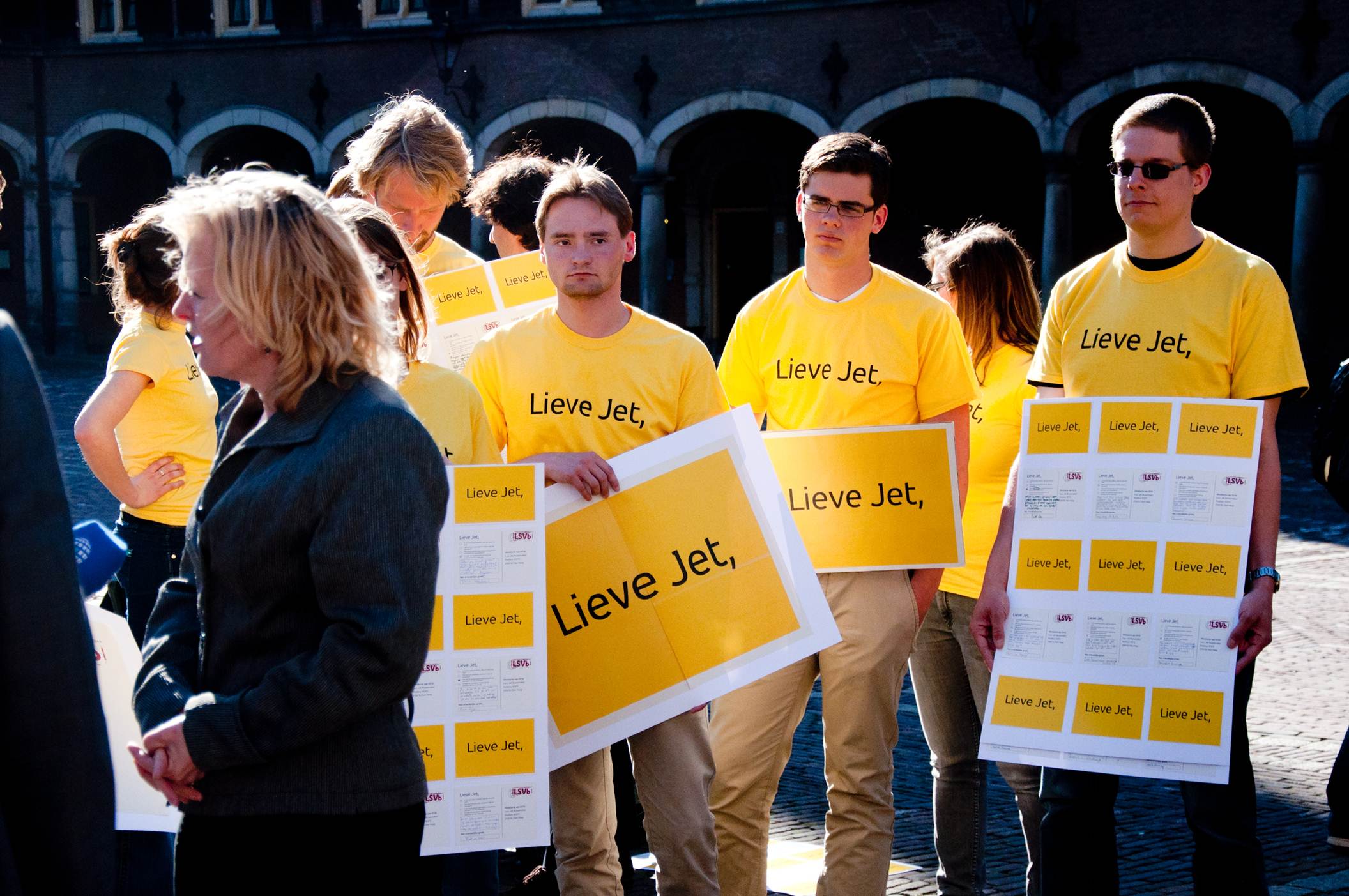 De LSVb had ouders, studenten en scholieren opgeroepen per briefkaart te protesteren tegen de aankomende bezuinigingen op studenten. Het kabinet wil de basisbeurs schrappen en de ov-studentenkaart versoberen, wat studeren duizenden euro’s duurder maakt. Via de website www.lievejet.nl kon iedereen gratis een briefkaartje versturen.
