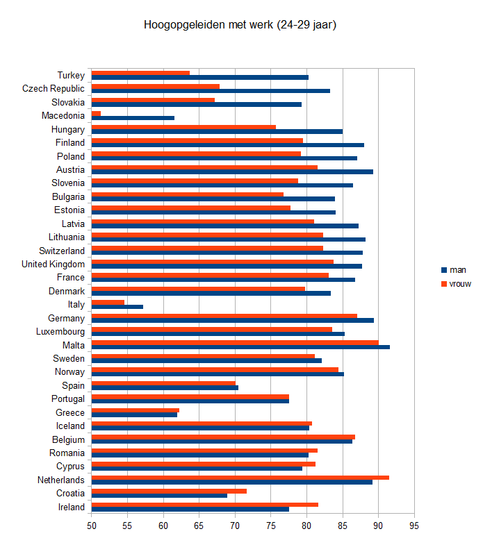 In Nederland had in 2011 slechts 72 procent van de hoogopgeleide mannen tot 24 jaar een baan. Onder vrouwen van die leeftijd was dat aandeel 81,8 procent. Een gender-kloof van bijna tien procentpunt in hun voordeel. Alleen in Noorwegen was het verschil volgens de Europese statistieken groter: daar had 61,6 procent van de mannen een baan, tegen 73 procent van de vrouwen.