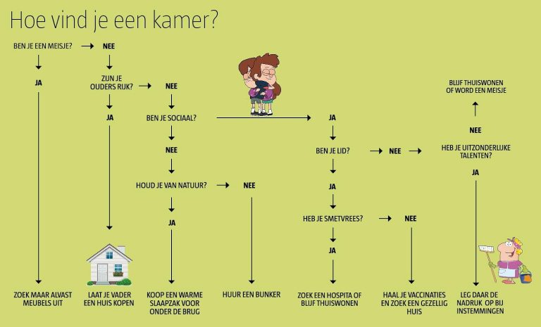 Diepersloot deed tien instemmingen en vond een week voor de Owee een kamer. “Een kast eigenlijk”, lacht hij. Binnen twee maanden was hij alweer weg. Nu woont hij met vrienden, veel beter. En zonder instemming. Maar aan de instemmingen die hij wel deed, heeft hij een lijst metdo’s en don’ts overgehouden waariedere kamerzoeker zijn voordeel mee kan doen. Want vervelend is het soms wel, om gekeurdte worden. “Vaak zijn er drie rondes, soms verdeeld over meerdere dagen. Vaak is de kamer waar het over gaat alleen voor tijdelijke onderhuur. En veel huizen bellen je niet eens terug als je het niet bent geworden.”