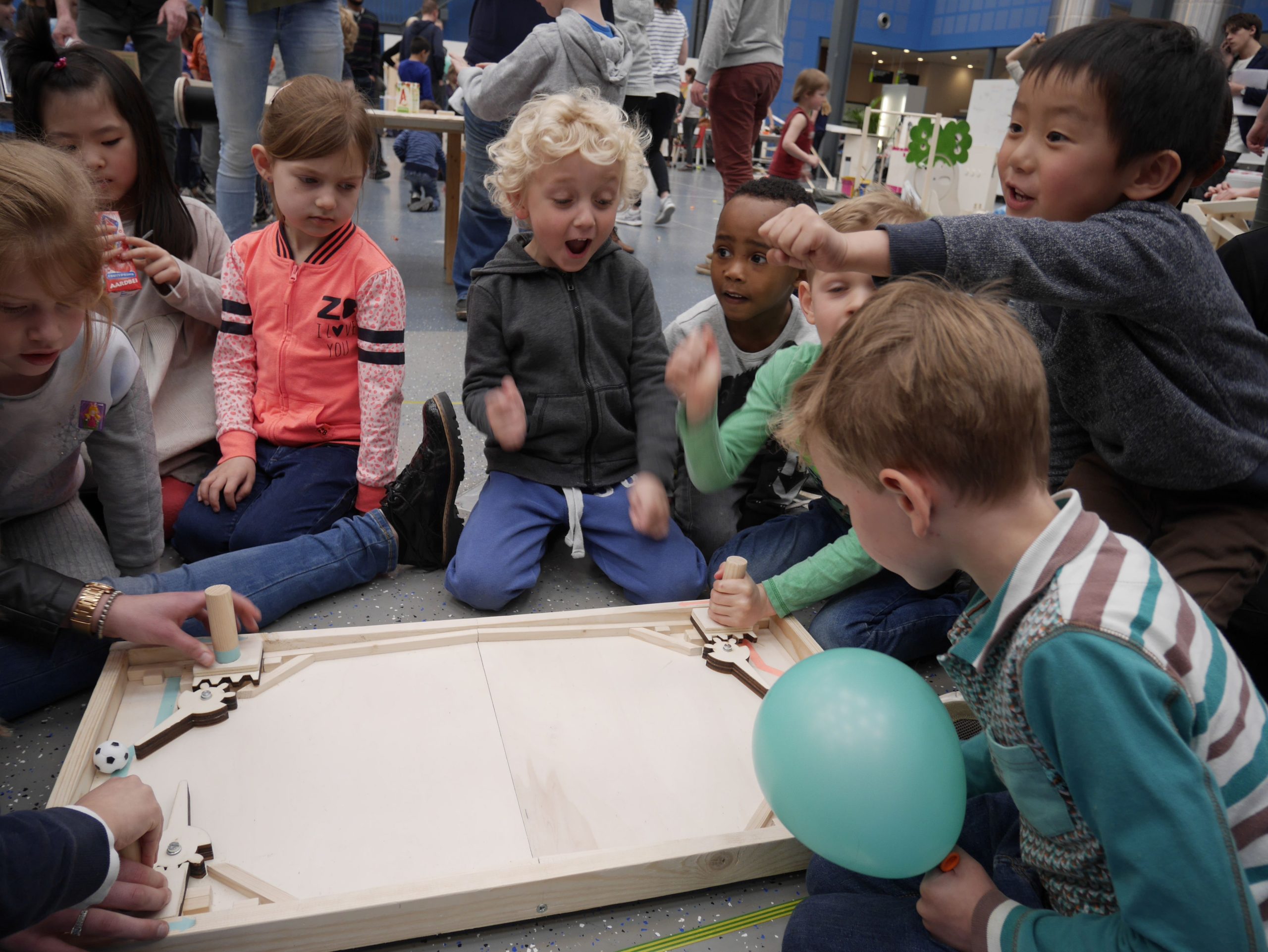 Gejuich van kleuters in de hal van Industrieel Ontwerpen. De jongens hebben een punt gescoord tegen de meisjes bij het houten flipperkastspel. Tweehonderd schoolkinderen zijn woensdagochtend 6 april op de TU om speelgoed-prototypes te testen die eerstejaars IO-studenten hebben ontworpen voor het vak ‘product ontwerpen 2’.
