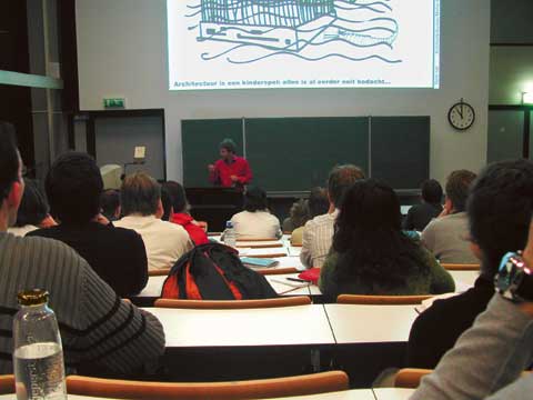 We zijn bij het MSc-1-college architectonisch ontwerpen. Onverwacht is De Haas van stal gehaald, omdat de Italiaan die eigenlijk zou spreken in Rome protesteert tegen zijn regering. Niet getreurd, zo houdt de coördinatrice ons voor, Micha de Haas is een waardig vervanger. En of we wat dichterbij willen komen zitten, want het microfoontje is zoek. Traag stommelt men naar voren.