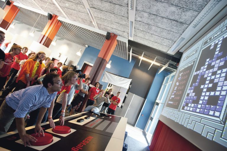 Een potje Super Mario of Tetris is een teamsport met deze game controller. “Je hebt er altijd een vriendje bij nodig”, zegt Ben Allen van Electrotechnische Vereeniging, de studievereniging van EWI. Samen met studiegenoten maakte hij ’s werelds grootste game controller (3,6 m breed, 1,55 m diep en 55 cm hoog) ter viering van het 105-jarige bestaan van de vereniging. Afgelopen dinsdag kwam een delegatie van de Guinness World Records om het nieuwe record in de analen op te nemen.