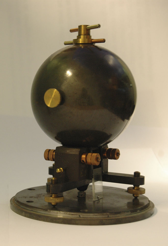 Deze bol stond in de TU Library als TU Delft Erfgoed mystery object met de prijsvraag: ‘Wat is dit?’ Toen niemand het antwoord bleek te kunnen geven, maakte de Library het iets minder mysterieus door de bol te openen. Haagse Hogeschool-student Laurens Ormskerk zag de binnenkant en wist het antwoord: het is een galvanometer. Een galvanometer meet elektrische stroom. Het object in kwestie is een bolpantsergalvanometer die door zijn zware pantser minimaal last heeft van externe magnetische invloeden. Ormskerk won een iPod.