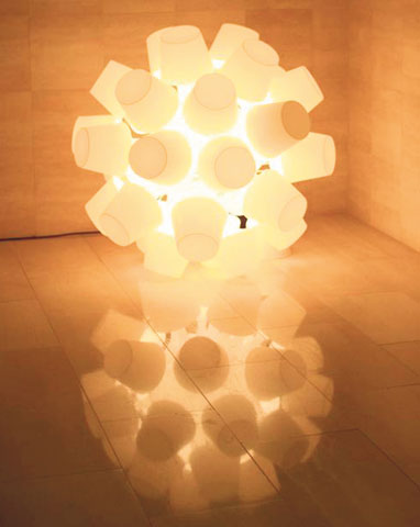 Het is een nogal doorsnee lampje, de Lampan van Ikea. Tot je een heleboel aan elkaar vastmaakt tot een soort kroonluchter, een ‘platonic sun’.