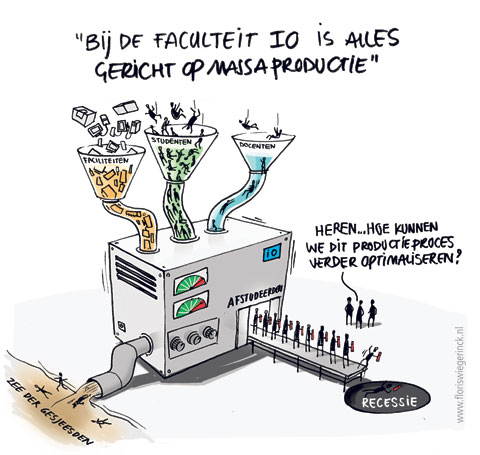 Studenten zouden als ‘makke lammetjes’ precies op de deadline moeten inleveren wat docenten van ze verwachten en soms zouden vakcoördinatoren planning ‘voorkauwen’. “Wij zijn voor het ontwikkelen van een eigen studiestijl, voor individuele ontplooiing”, zegt Van de Kamp. Overkoepelend probleem is volgens hem dat de faculteit een langetermijn visie mist.
