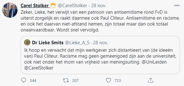 For Rector Magnificus Carel Stolker this all seems to have reached a limit. “The accusation of a pattern of anti-Semitism around FvD is extremely worrying and touches Paul Cliteur”, he twittered. “Anti-Semitism and racism, as well as the failure to distance oneself from them, are totally unacceptable. To be continued soon”. (HOP, Bas Belleman)