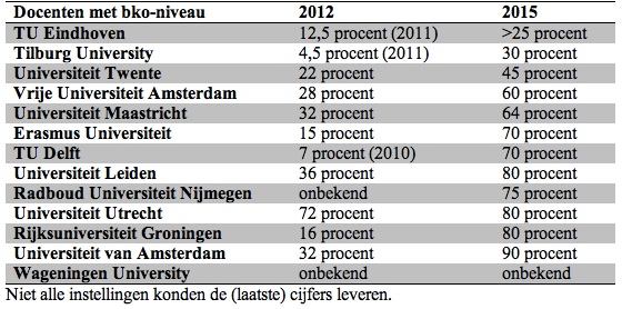De VSNU inventariseert momenteel hoeveel docenten hun bko hebben behaald. De onderlinge verschillen zijn groot, zegt beleidsmedewerker Sake Slootweg. Universiteiten hebben afspraken gemaakt over de normen, maar zij mogen vaak zelf weten hoe een bko-traject er uitziet. Docenten moeten meestal een aantal cursusmiddagen volgen en een portfolio opbouwen.