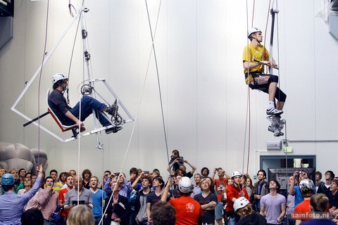 Dit jaar moesten de studenten een fiets bouwen die langs een kabel verticaal omhoog beweegt. De student in het gele shirt bereikte het snelst een hoogte van twaalf meter en won de competitie.