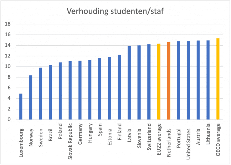 The workload among lecturers is also relatively high in the Netherlands. On average, one lecturer teaches 15 students, putting the Netherlands a little above the OECD average. On the other hand, the higher education workforce is relatively young.