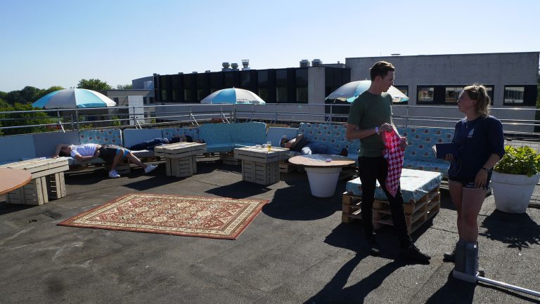 Kunnen buurtbewoners langskomen? “Ja, zeker! We willen juist aan zoveel mogelijk mensen laten zien wat we hebben neergezet”, zegt Bartelings. “De toneelstukken zijn voor iedereen te bezoeken, en er is een concert. Voor de bewoners die een kijkje willen nemen in dit pand; zij kunnen op beide zondagen langskomen op ons foodtruckfestival. We deelden al vierduizend consumptiebonnen uit aan de buurt. Op 15 juli kijken we ook de finale van het WK op een groot scherm.”