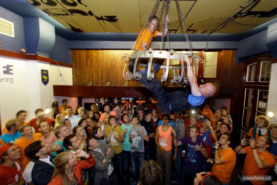 De rand beetpakken en hup… je voeten er in slingeren. Zo klauter je in de kroonluchter bij de Delftsche Studenten Bond. Rector Karel Luyben lukte het dinsdagnacht na een keer of vijf.