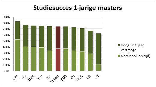 Wie lekker snel klaar wil zijn met zijn eenjarige masteropleiding, kan het best naar Maastricht verhuizen. Daar studeert de helft van de studenten binnen één jaar af en is meer dan tachtig procent binnen twee jaar klaar.