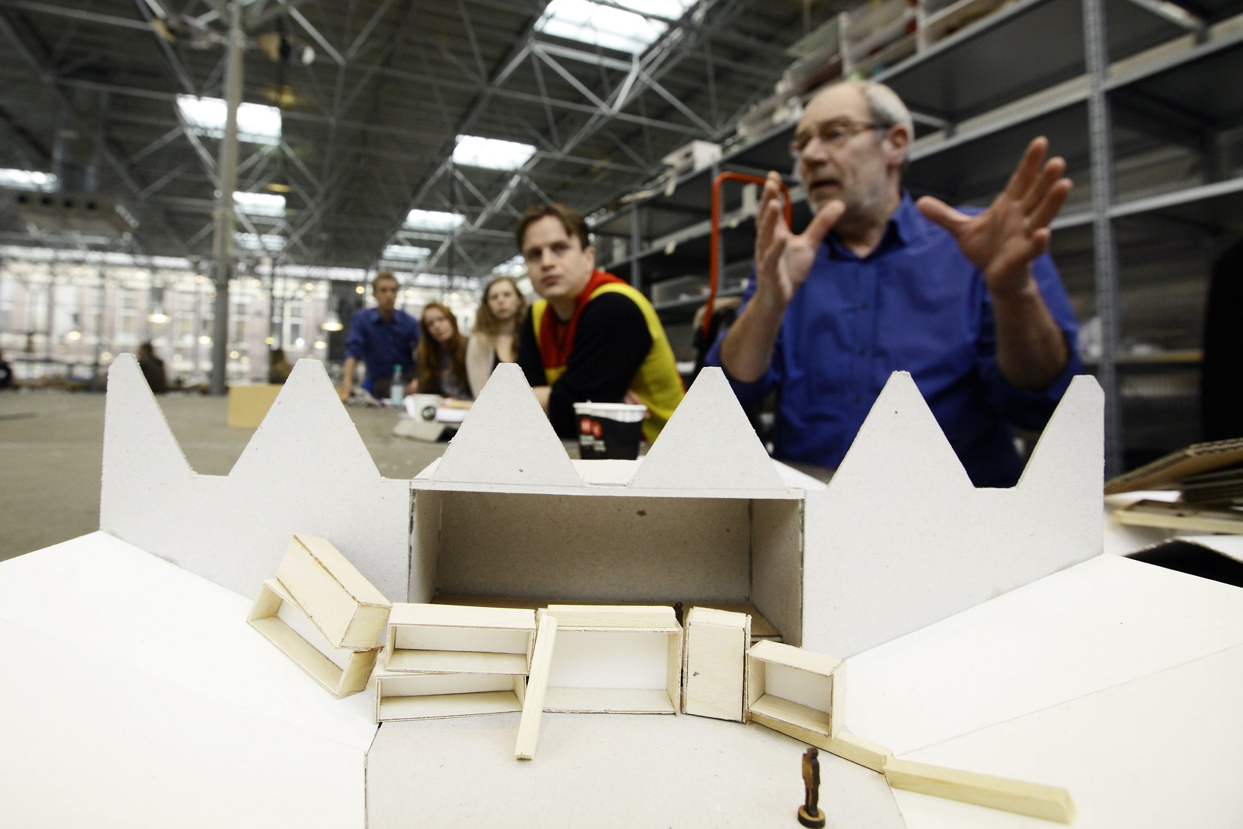 4 maart 2015. Tien gespannen honours studenten zitten rond een grote tafel in de maquettehal van Bouwkunde. “Het uur u: de presentatie”, begint docent Van de Laar in aanwezigheid van de regisseur, scriptschrijver en Steenhuisen. Sinds oktober zijn de studenten bezig aan een decorontwerp. Ze hebben het toneelstuk geanalyseerd, de schrijver en regisseur geïnterviewd, een locatieonderzoek gedaan voor de maten in het auditorium, de technische mogelijkheden uitgezocht en verschillende decors ontworpen. Daaruit koos Van de Laar een definitief ontwerp dat ze nu hebben uitgewerkt, technisch én op haalbaarheid en financiën.