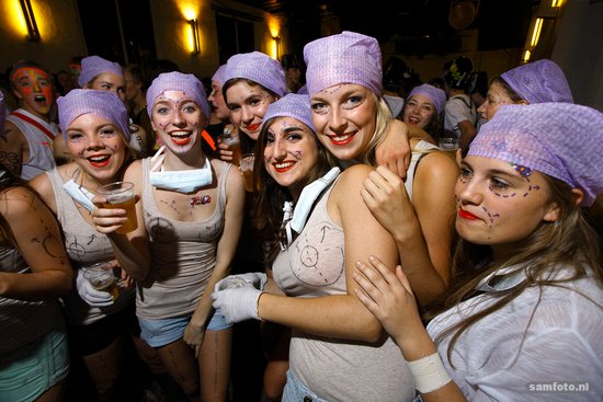 Het Mega Allerheiligen Feuten Festijn voor eerstejaars, afgelopen donderdag bij Virgiel. Virgilianen in de sociëteitszaal zijn in afwachting van de aankomst van alle AHC-zusterverenigingen uit andere studentensteden.