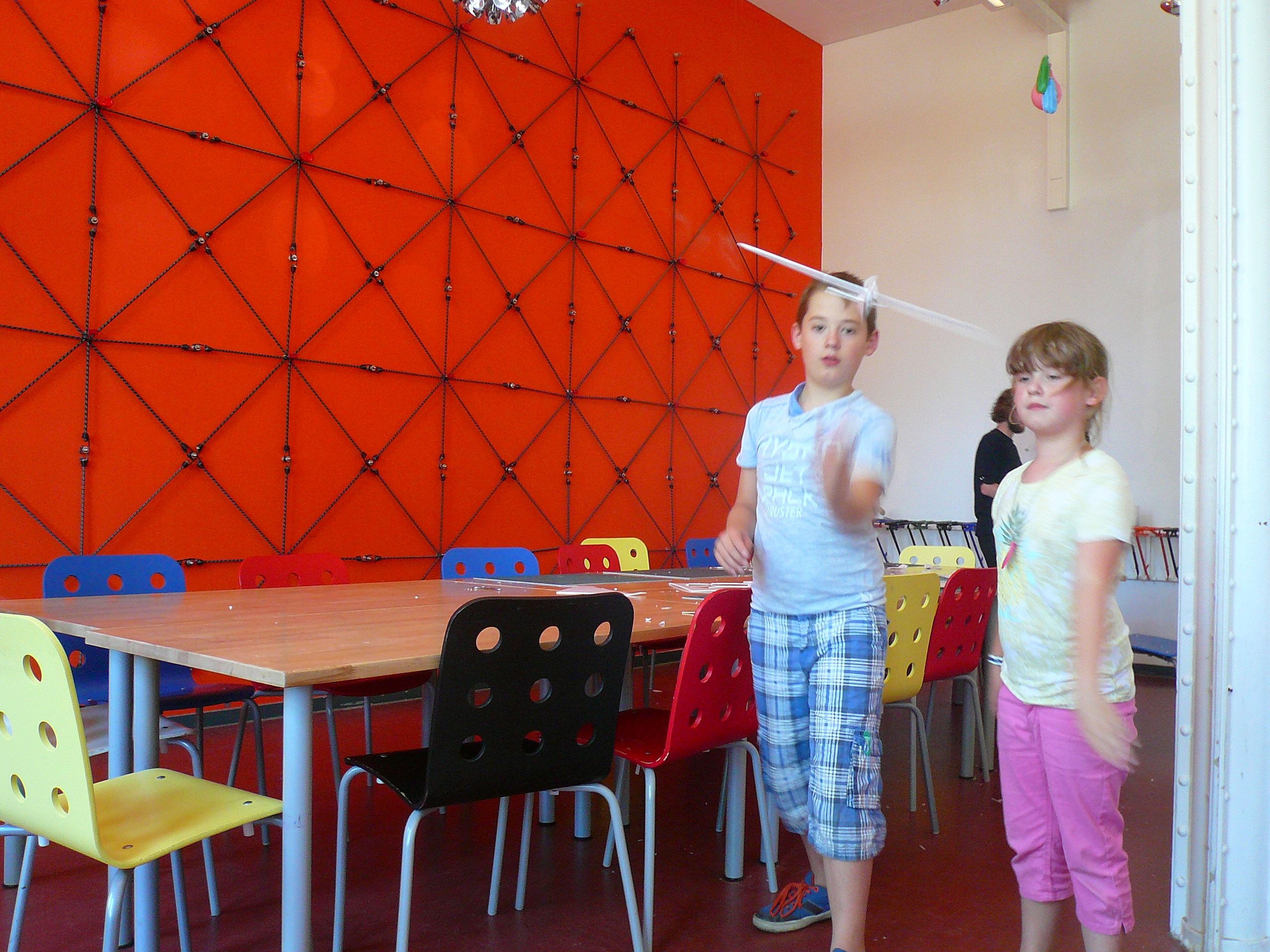 Tim (9 jaar) en Laura (6 jaar) uit Maassluis gooien tegelijk hun vliegtuigjes de lucht in. Tien meter halen ze met gemak. “In de windtunnel komen ze nog veel verder”, zegt Tim. “Dat hebben we net getest. Je moet ze dan wel met de wind mee gooien natuurlijk.”