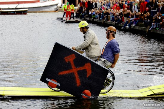 Te water ging het ene na het andere oude barrel. Versierd met soms niet meer dan wat ballonnen, maar ach wat maakte het uit. Spektakel leverde het op. En in alle gevallen een nat pak.