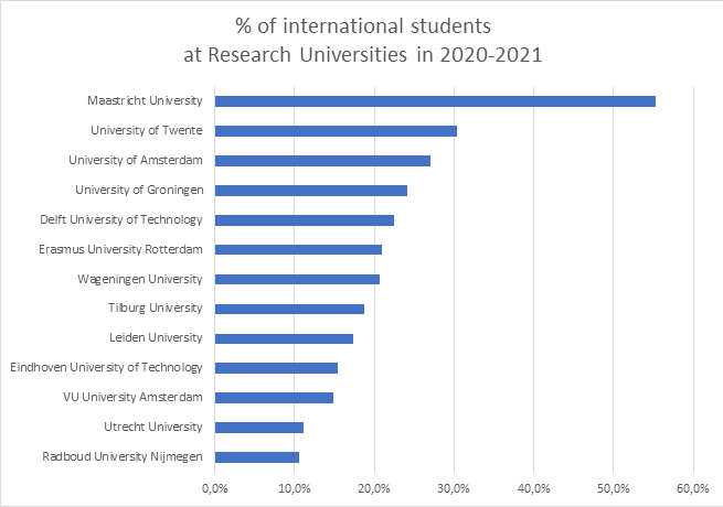 Yet Maastricht is likely the most international university. There, more than half of the university student population came from abroad: 55.3 percent. At number 2, the University of Twente, this was “only” 30.3 percent.