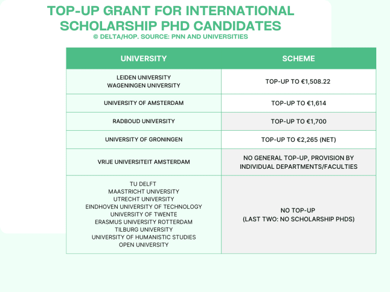 According to a study by PNN and HOP, five of the fifteen Dutch universities provide their international scholarship PhD candidates with some financial assistance.