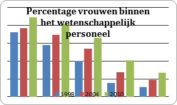 Maar in de wetenschap lopen vrouwen nog altijd achter. En hoe hoger de wetenschappelijke functie, hoe groter de achterstand. Bijna de helft van de promovendi (45 procent) is vrouw. Onder universitair docenten is één op de drie een vrouw, onder universitair hoofddocenten is dat één op de vijf en onder hoogleraren één op de zeven.