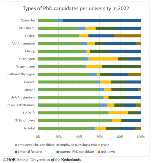 More than half of the PhD candidates at Dutch universities are in employment. The rest are trying for a PhD at their own expense or for example with a foreign grant.