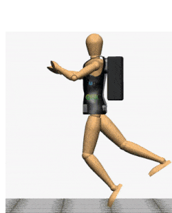The illustration of the gyroscopic effect of the backpack. When the person falls, the force sets off the spinning devices to produce the gyroscopic effect, indicated by the red arrow. (Source: TU Delft Gyroscopic Balance Assistance Research Group)