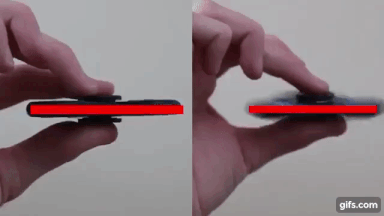 The axes comparison between the static and the spinning fidget spinner. When the spinning one is tilted, its axis is briefly slanted until it readjusts. (Source: Clipped from a Technicality video, YouTube)
