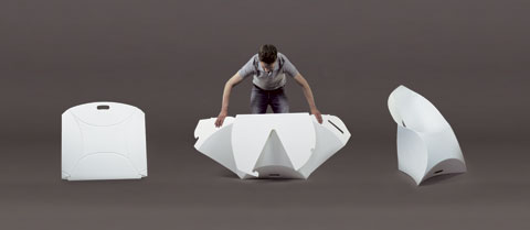 Van een tekenmap in een handomdraai een echte, stevige stoel vouwen. De fluxchair, een uitvinding van industrieel ontwerper ir. Douwe Jacobs, komt volgende maand in vijftien landen op de markt.