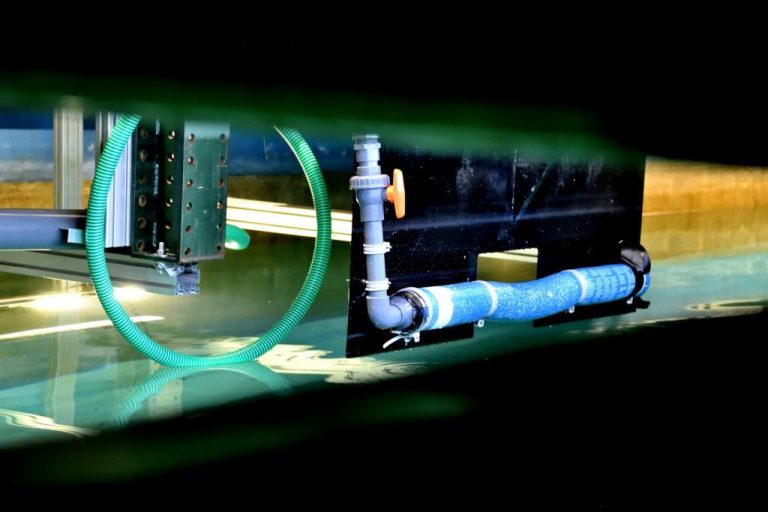Test in TU Delft sleeptank van opblaasbare drijvers voor binnenvaartschepen. (Foto: Novimove)