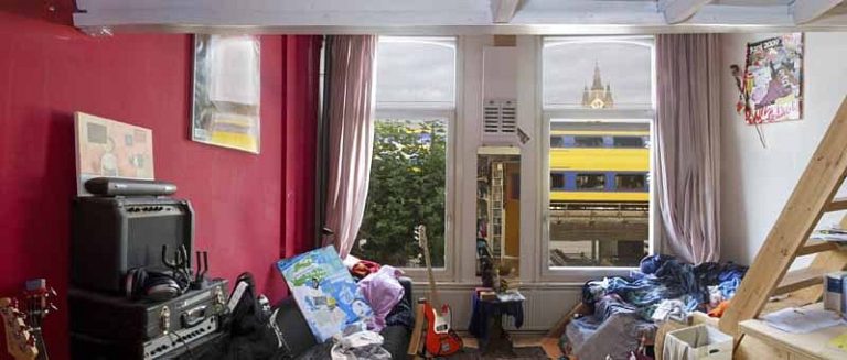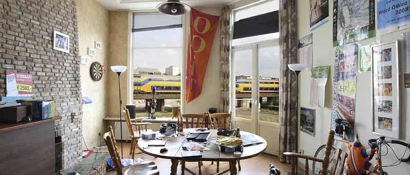 Fotograaf Coen de Jong maakte de foto’s vijf jaar geleden. Rommelige studentenhokken, een pruikenwinkel, ouderwetse woonkamers met donkerbruin meubilair: allemaal zijn ze vereeuwigd met achter de ramen de knalgele NS-trein die 350 keer per dag langsreed. De foto’s zullen komen te hangen in het nieuwe stadskantoor dat tegen het vernieuwde station aan staat.