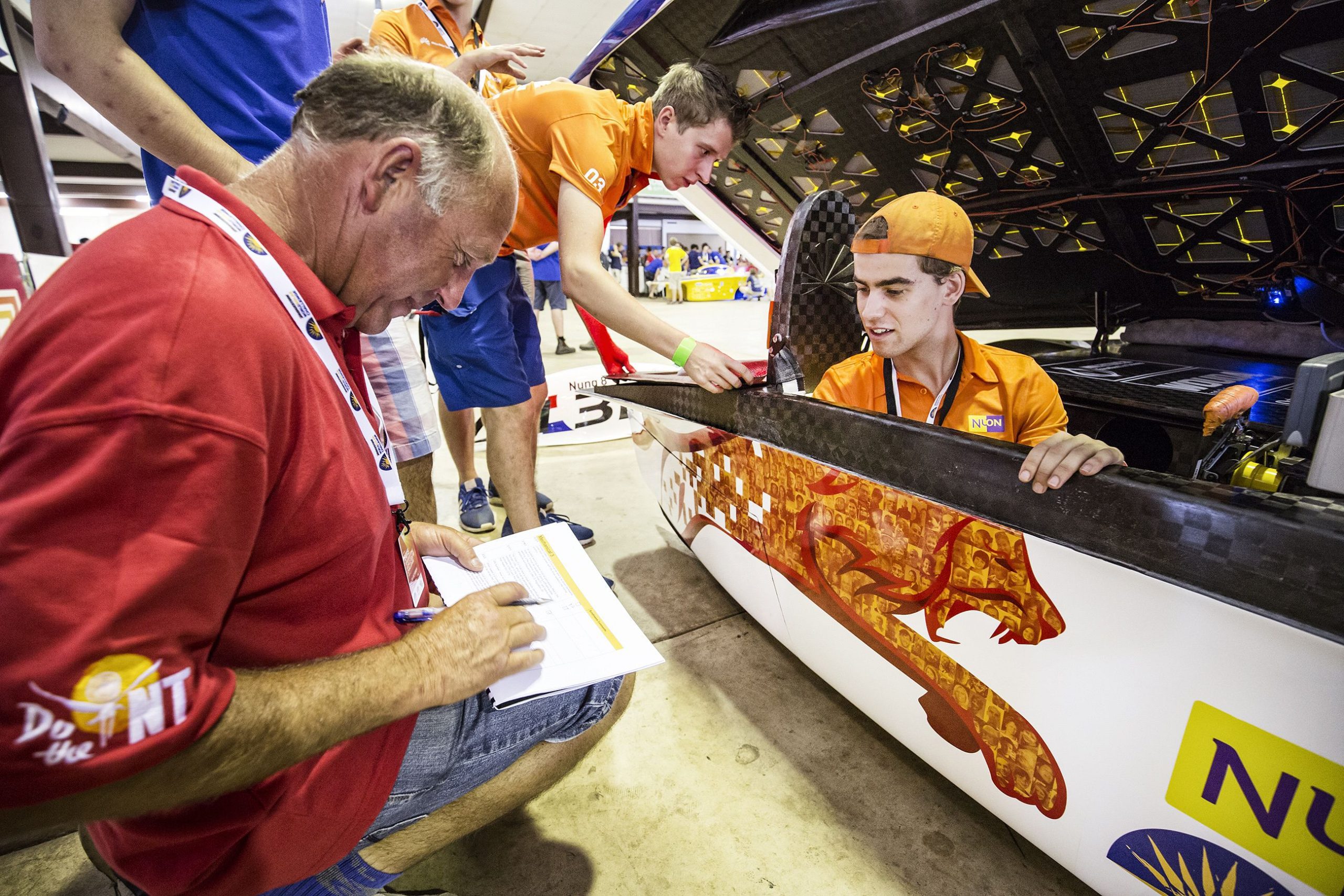 Het is ook het moment waarop de nieuwste innovaties te zien zijn en teams elkaars auto’s uitgebreid bekijken. Het Nuon Solar Team liet bij de keuring voor het eerst de ‘trailing edge’ zien, een 3D-geprinte staartvin aan de achterkant die de stroomlijnen aanzienlijk verbetert. “We bouwen onze zonnewagen met carbon, een stijf en superlicht materiaal. Een van de nadelen is dat je daarmee de achterkant eigenlijk niet scherp genoeg kan maken voor een optimale stroomlijn. En luchtweerstand is in de wedstrijd verreweg het belangrijkst. Daarom heeft DSM voor ons een scherpe, holle staartvin gemaakt met een geavanceerde 3D printer”, vertelt Joris van den Berg, aerodynamica-specialist van het Nuon Solar Team. De staartvin weegt slechts 250 gram, evenveel als een pakje boter, en is geheel transparant zodat de achterlichten goed zichtbaar blijven.
