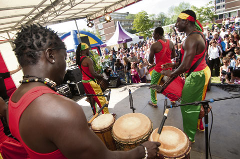 Op de foto Sene Percu, een Afrikaanse percussie- en dansband uit Senegal.
