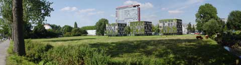 Drie vierkante gebouwtjes, die woonruimte bieden aan 206 exchange-studenten, zullen vanaf februari verrijzen aan de Leeghwaterstraat. Een eis van de gemeente was, dat de torentjes aan de weilandzijde opgaan in het groen. De oplossing: klimop en klimaf. (Afbeelding: Mecanoo Architecten)