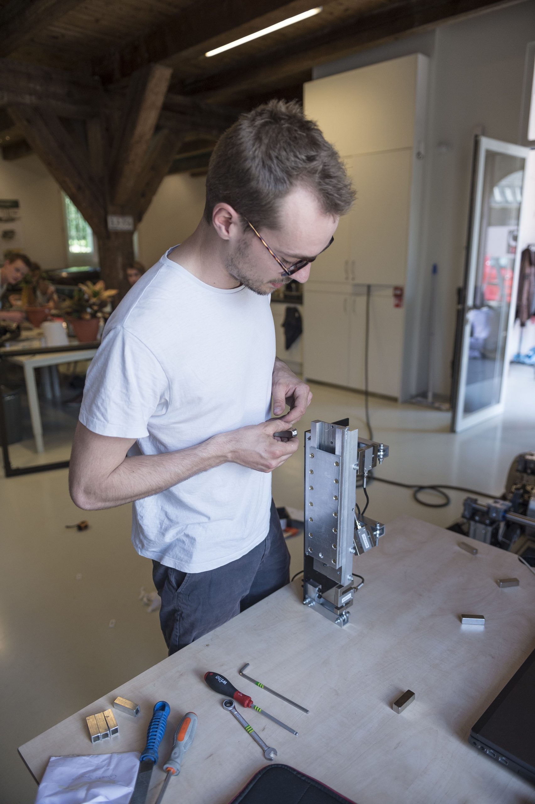De capsule remt af door de magneten van weerszijden vlakbij de middenbalk te brengen. Dat effect is zo sterk dat volgens de ontwerpers een mechanische rem overbodig is. Tammo Schwietert freesde de magneethouders, boorde gaten om bouten te verzinken en tapte er draad in. Joost de Jong maakte onderdelen voor de ophanging op de draaibank. Daarmee is de stijfheid van de vering in te stellen. Bauke Kooger assembleerde de magneethouders en bouwde er de kracht- opnemers in.