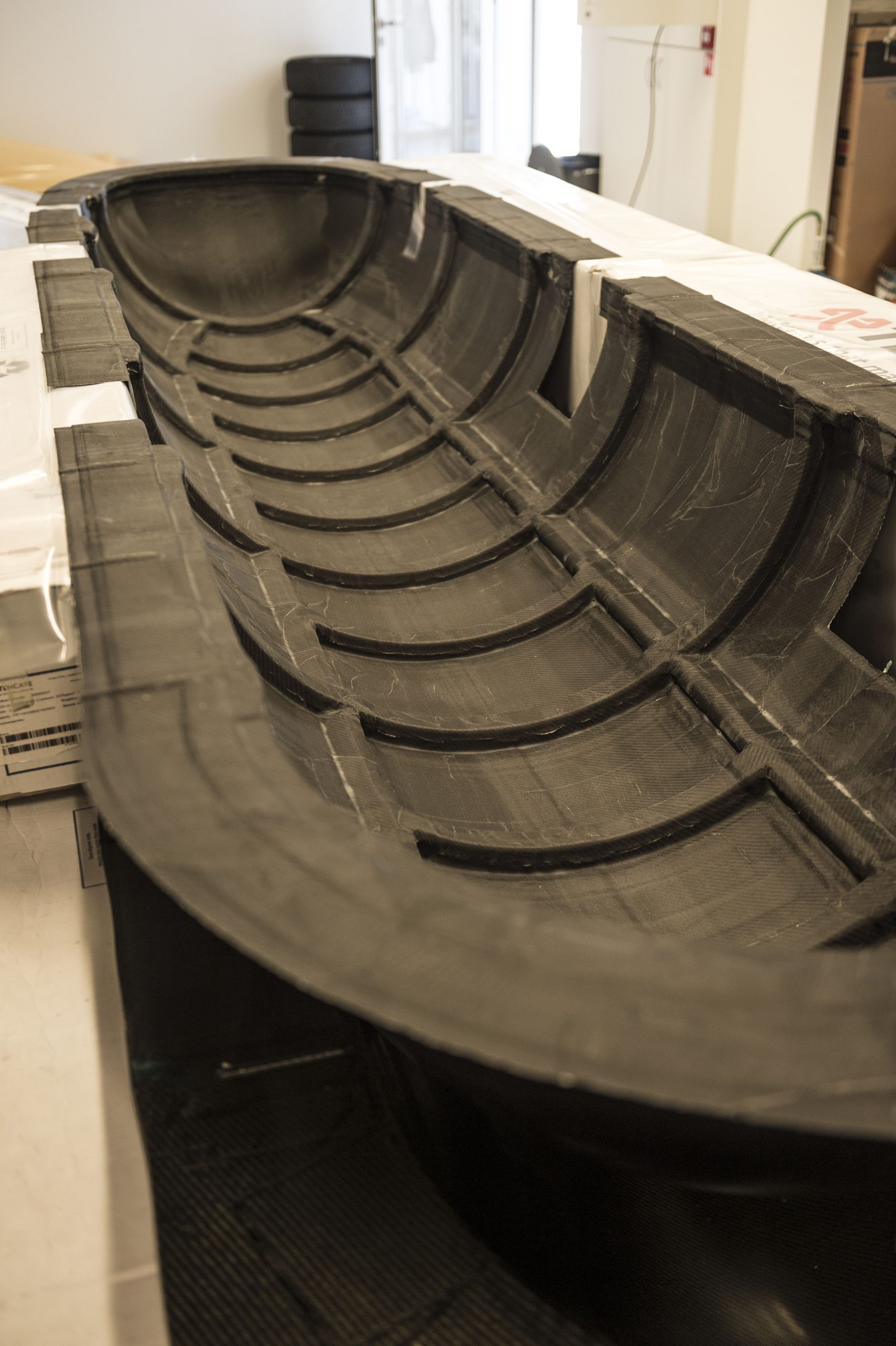 De Hyperloop-capsule wordt gebouwd op schaal 1 op 2. Je kunt er dus wel in liggen, maar nog niet in zitten. Het chassis is gemaakt van koolstofvezel met kunsthars. Dat wordt in de mal vacuüm gezogen om het stevig samen te drukken. Dan gaat het geheel vier uur lang in de oven om uit te harden. Ook de covers over de magnetische dragers zijn van hetzelfde materiaal gemaakt. De sterkte is nodig om de drukverschillen aan te kunnen (binnen atmosferische druk en buiten vacuüm) en om de krachten in de ophanging op te vangen.