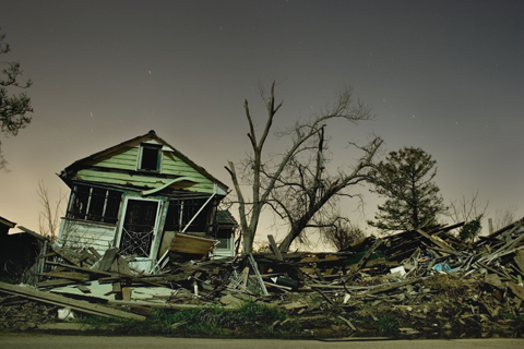 Van elke fotograaf zijn drie foto’s te zien: voor, tijdens en na de alles verwoestende orkaan van 2005. Dat levert werkelijk schitterende beelden op zoals bovenstaande foto Clouet van topfotograaf Frank Relle.