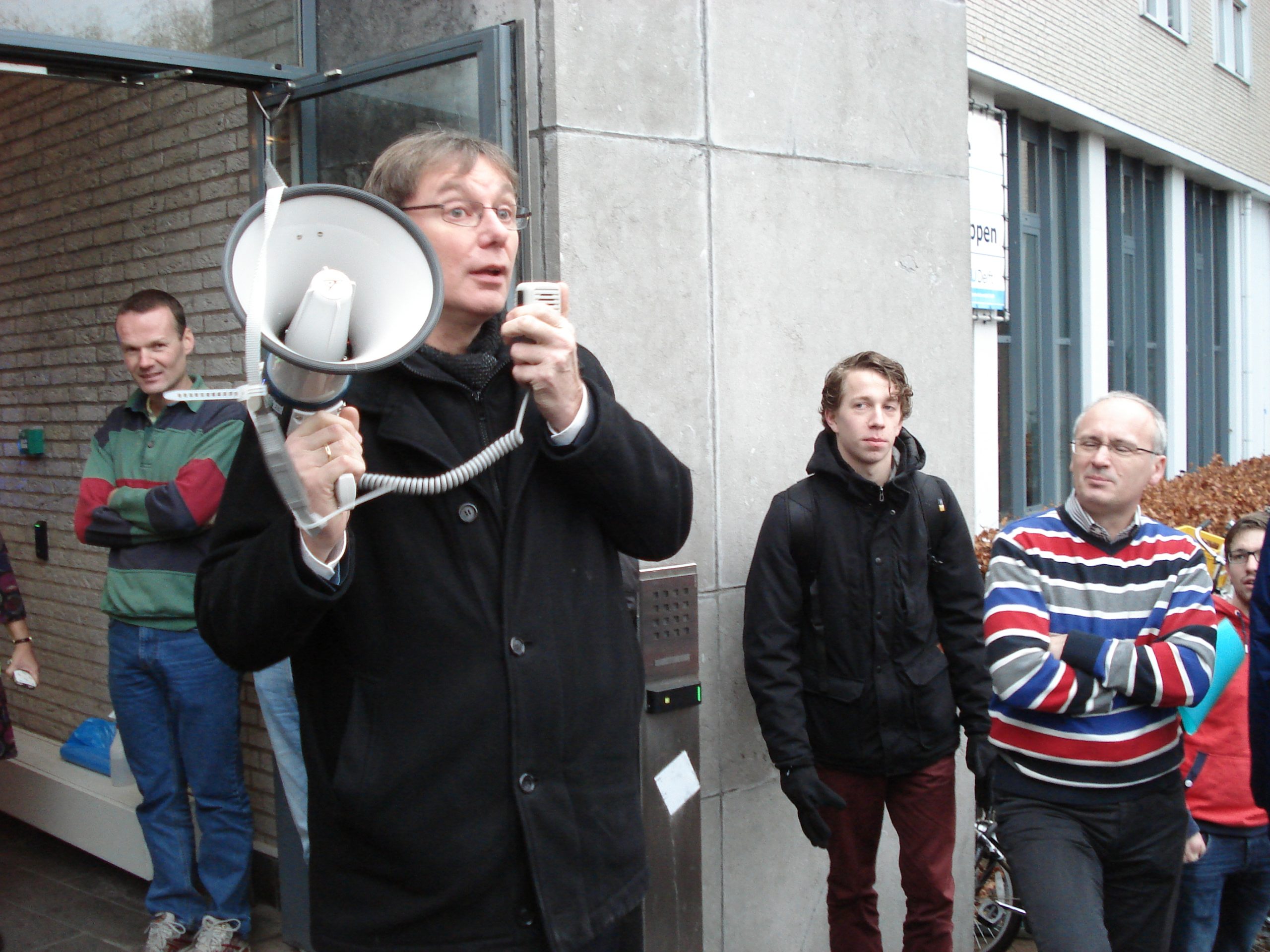Decaan Theun Baller vraagt de aanwezigen op last van de brandweer naar de aula te gaan.