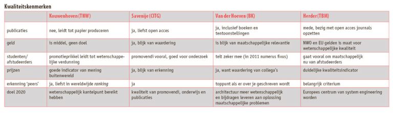 Kouwenhoven gelooft niet in meetbare criteria voor wetenschappelijke excellentie. Toch, en dat is de paradox, weet iedereen in het betreffende wetenschapsgebied wie er toe doen, wie de rising stars zijn van een vakgebied. Kouwenhoven vertelt dat aan Amerikaanse universiteiten onderzoekers geëvalueerd worden door aan een tiental collega’s buiten de universiteit te vragen hoe ze de kandidaat inschalen tussen andere onderzoekers. Die lijstjes vertonen vaak opvallende gelijkenis, constateert de nanofysicus. Mensen weten dat door een opvallend artikel, door voordrachten op congressen, door gesprekken met anderen. Eigenlijk kunnen alleen de peers elkaar onderling beoordelen, en dan heerst er vaak een behoorlijke consensus.