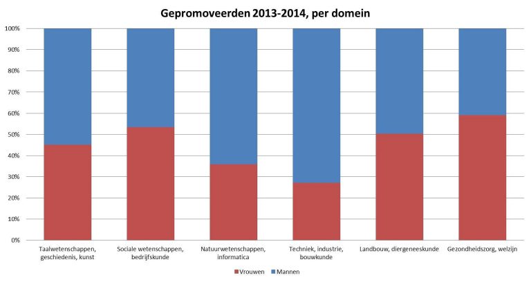 In de gezondheidszorg zijn vrouwelijke promovendi al jaren in de meerderheid, maar in 2013 zijn er voor het eerst ook in het domein sociale wetenschappen en bedrijfskunde meer vrouwen gepromoveerd dan mannen. Het domein techniek, industrie en bouwkunde blijft een mannenbolwerk: daar was in 2013 iets meer dan een kwart van de gepromoveerden vrouw.