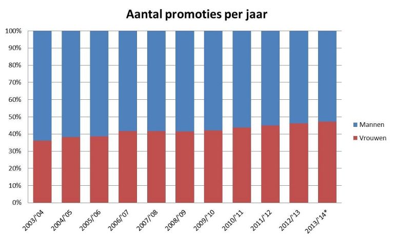 In het collegejaar 2013-2014 vormden vrouwen 47 procent van het totale aantal gepromoveerden, blijkt uit nieuwe cijfers van het Centraal Bureau van de Statistiek. Vorig jaar was dat nog een procentje minder. Vrouwen werken gestaag aan een inhaalslag: in 2003 was slechts 36 procent van de promovendi vrouw.