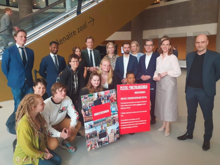 De activisten van #NietMijnSchuld hebben op 29 maart een petitie aan de Tweede Kamer overhandigd. Eind 2019 ging deze al online. Initiatiefnemers de Landelijke Studentenvakbond en FNV Young & United verzamelden uiteindelijk 87.866 handtekeningen voor ‘schuldenvrij studeren’. Ze willen een hogere basisbeurs en volledige compensatie voor de pechstudenten die de beurs sinds 2015 zijn misgelopen.