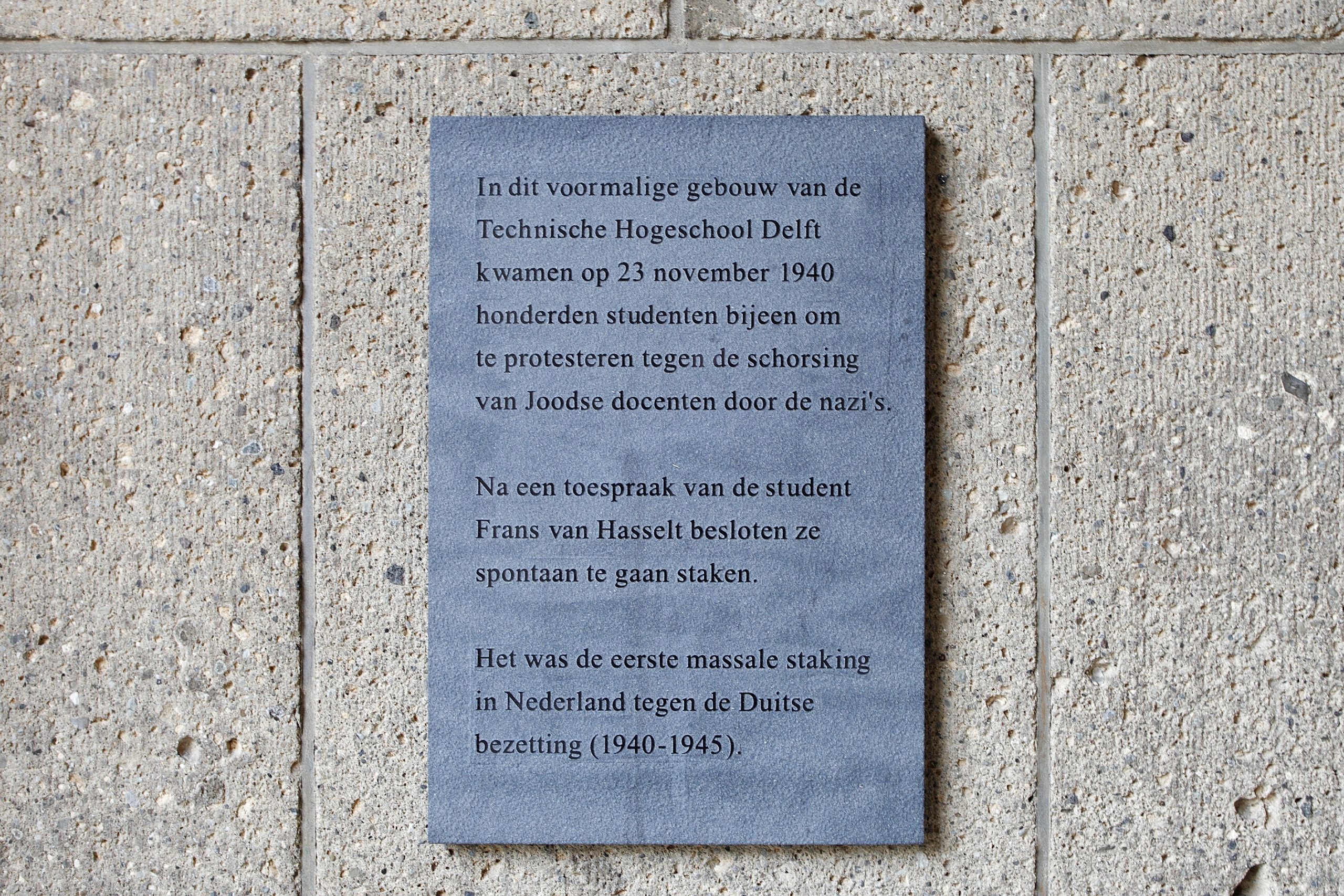 The plaque to commemorate Frans van Hasselt’s speech. (Translation: On November 23, 1940, hundreds of of students gathered in this building, formerly belonging to the Technical University of Delft, to protest against the suspension of Jewish teachers by the Nazis.