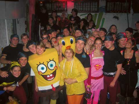 Binnen koop ik mijn bonnetjes bij Sjoerd Zonderland. Hij bivakkeert in een omgebouwd telefoonhok dat nu dient als kassa. “Kan ik deze mooie dames helpen?”, vleit hij. De tuin is omgebouwd tot disco. Op de muren prijken filmhelden als Superman en John Travolta. Het schijnt dat de heren boxen hebben geregeld van Red Bull, die een hele concertzaal kunnen platspelen. Ze staan nu op een tiende van hun vermogen. En dat is hard. Goede muziek. Veel vrouwen. Opvallend veel mooie mensen. Hoewel, er zijn ook een heleboel mensen in thema. Het thema van vanavond is ‘Frontstreet Bros. Movieworld.’ Wat nogal veel aan de verbeelding overlaat. Ik zou dan ook niet iedere gast kunnen typeren in zijn outfit. Veel zwarte pieten. Zwangere vrouwen. Clowns. En mannen in pyjama’s, maar dat is misschien uit voorzorg.
