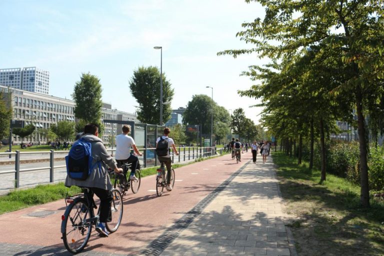 Sensors in this bike path register how much traffic is racing over it at what speed and at what time. The data is collected for the Smart Urban Mobility project led by Professor Serge Hoogendoorn. This research aims to develop sustainable, efficient and innovative mobility solutions to keep the cities of the future accessible and liveable. The company PlasticRoad has developed the bike path. The PlasticRoad consists of a prefab, modular road construction based on recycled plastic and has a hollow space which can be used as (temporary) water storage and thus prevents flooding during extreme rainfall. The top layer is made of the same material (crushed stone) as that used for regular cycle paths.